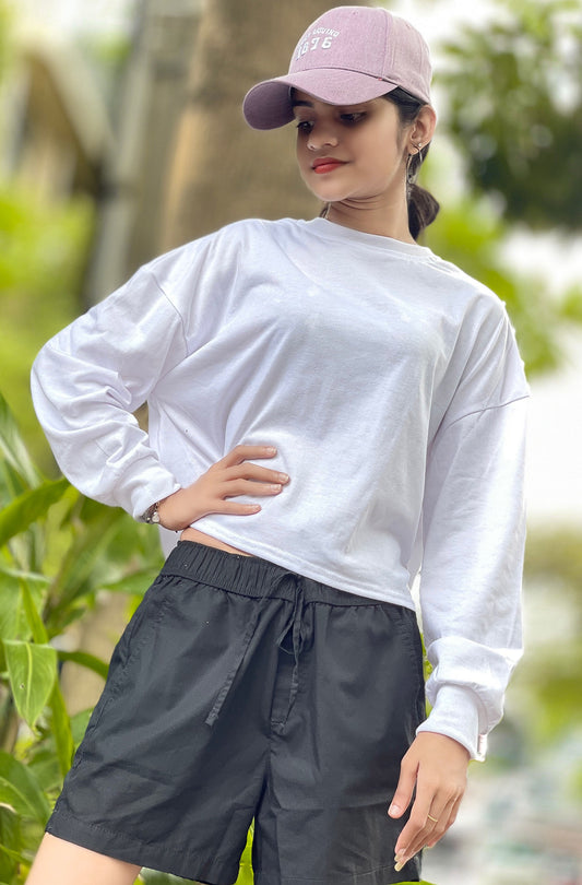 Drop Shoulder Oversized Long Sleeve White Color Short T Shirt | GM196