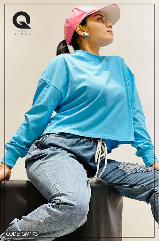Drop Shoulder Oversized Long Sleeve Sky Blue Color Short T Shirt | GM173
